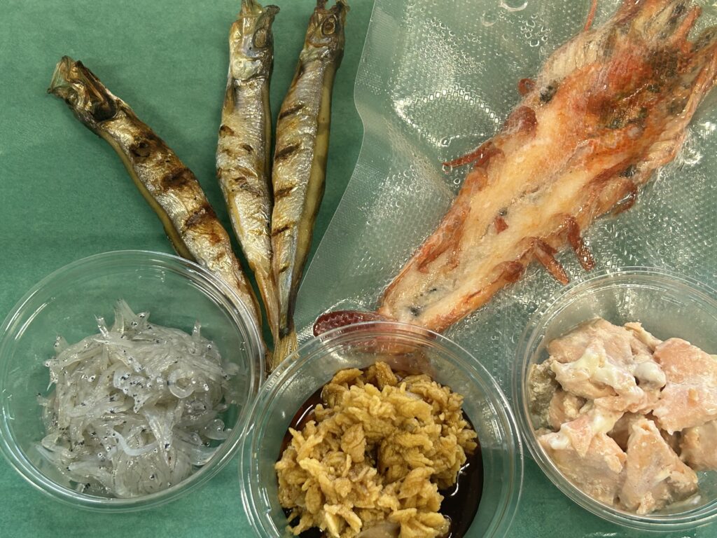 今回は焼き車海老、焼きアジみりんの干物、